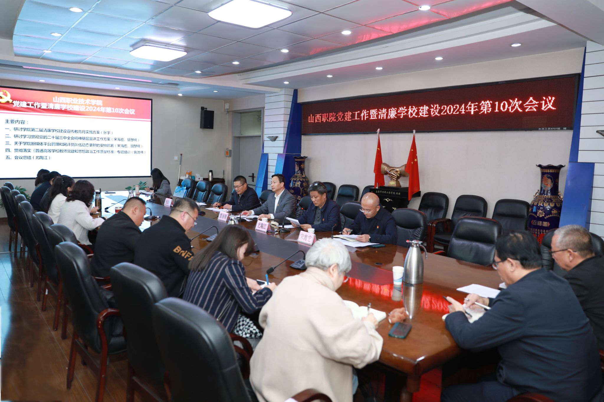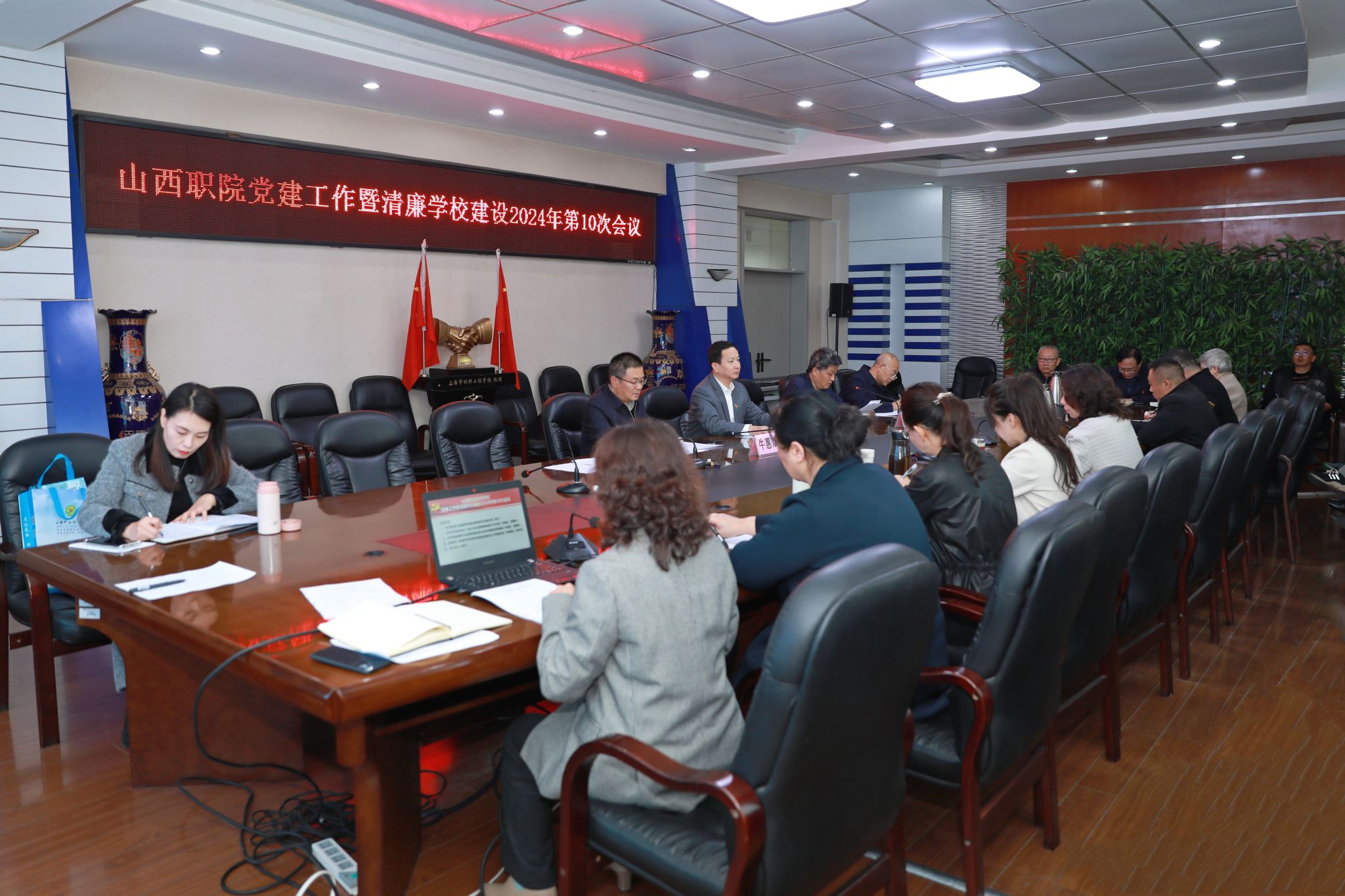 10月29日下午,学院2024年度第十次党建工作暨清廉学校建设例会在坞城校区四层会议室召开。会议由学院党委副书记尤陶江主持,学院党委书记雷承锋、纪委书记牛惠斌出席会议。党政办公室、纪委办公室、组织人事部、宣传统战部、等部门相关人员,各校区党工委、各党总支负责同志参加会议。